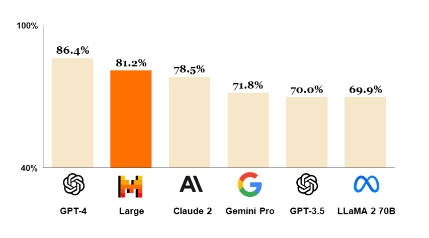 Below is a chart showing how Mistral Large compares with other powerful LLMs like GPT-4 and Gemini Pro. It ranks second next to GPT-4 on the MMLU benchmark with a score of 81.2%.