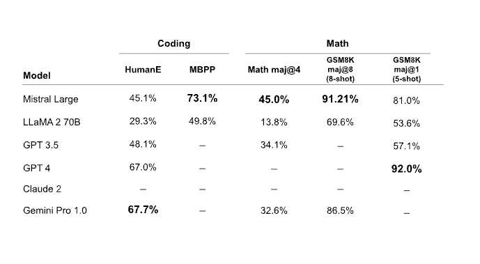 The table below shows how Mistral Large performs on common maths and coding benchmarks. Mistral Large demonstrates strong performance on the Math and GSM8K benchmarks but it is significantly outperformed on coding benchmarks by models like Gemini Pro and GPT-4.