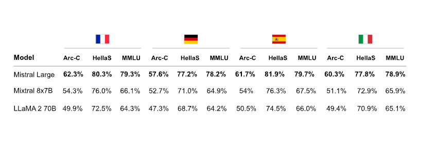 The table below demonstrates Mistral Large performance on multilingual reasoning benchmarks. Mistral Large outperforms Mixtral 8x7B and Llama 2 70B in all languages, including French, German, Spanish, and Italian.